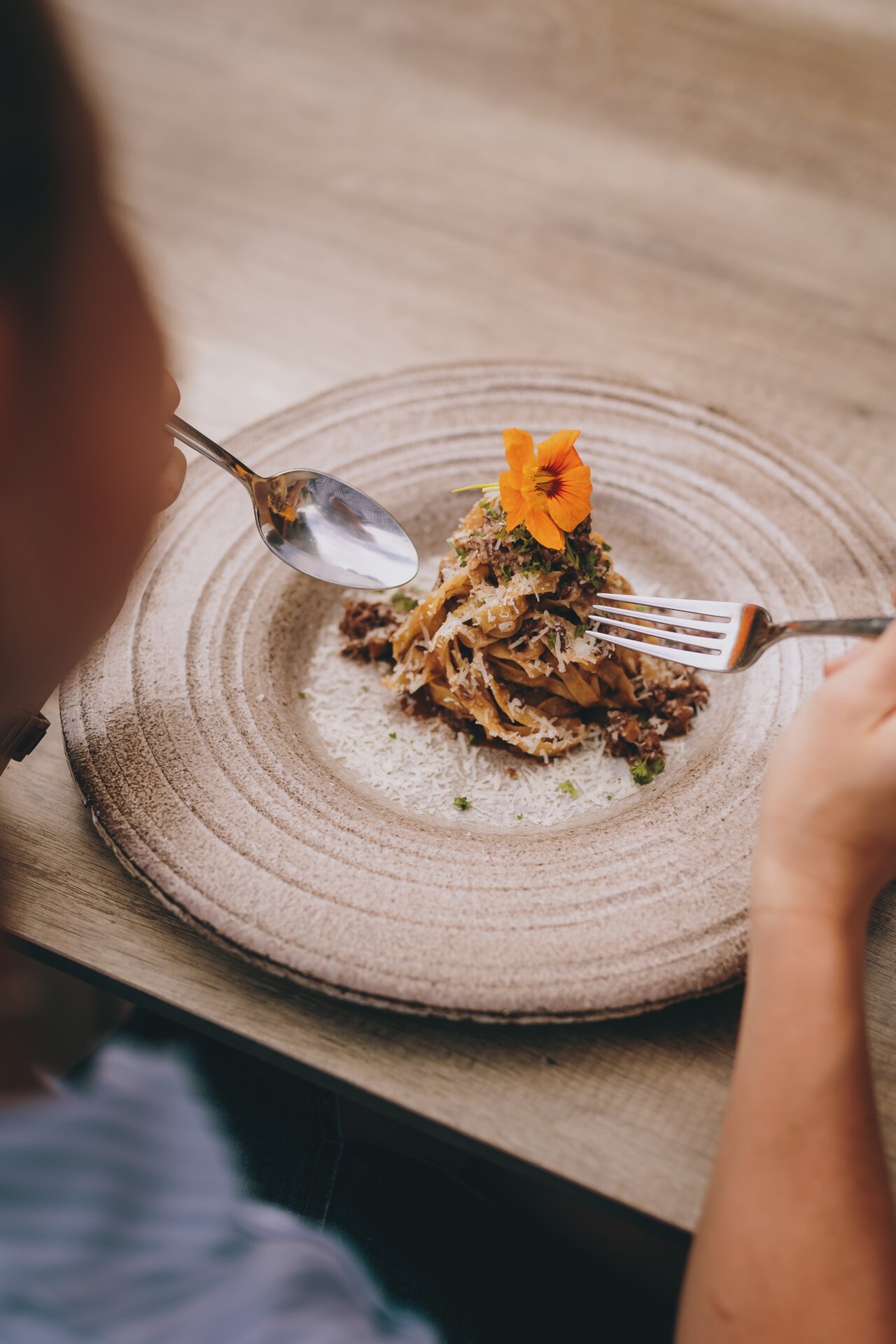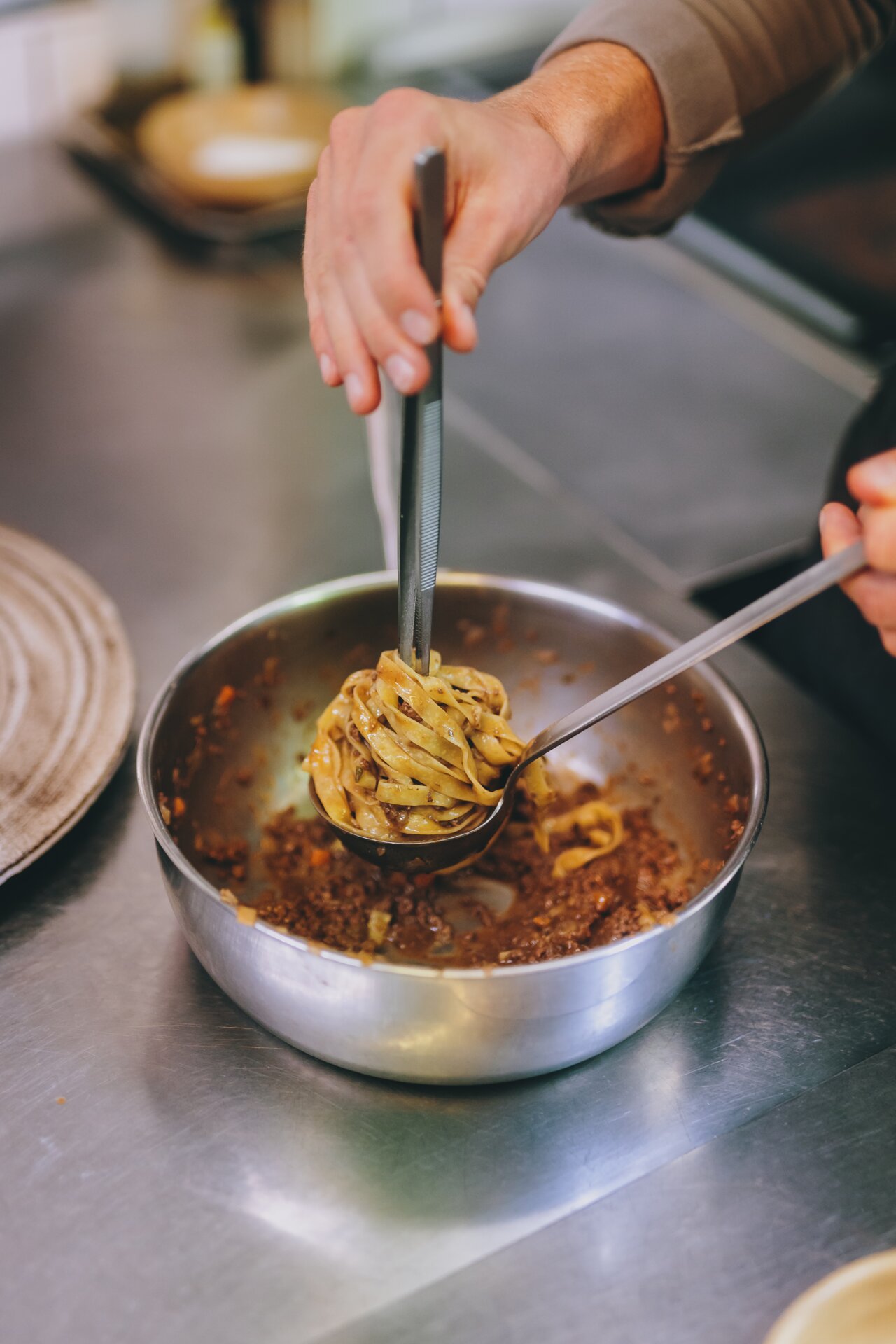Rehbolognese mit hausgemachter tagliatelle, geschmorter kohlrabi & eingelegtes gemüse