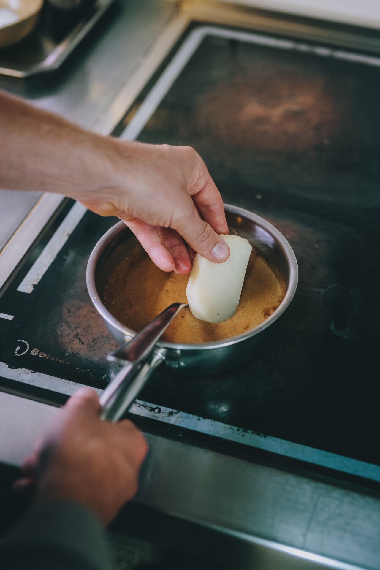 Nach dem Backen/Schmoren die Knollen auskühlen lassen und schälen, die Schalen mit den vorherigen Abschnitten in einem Topf mit ca. 500mml Wasser ansetzen und zum Kochen bringen. Den Fond ca. um 2/3 reduzieren.