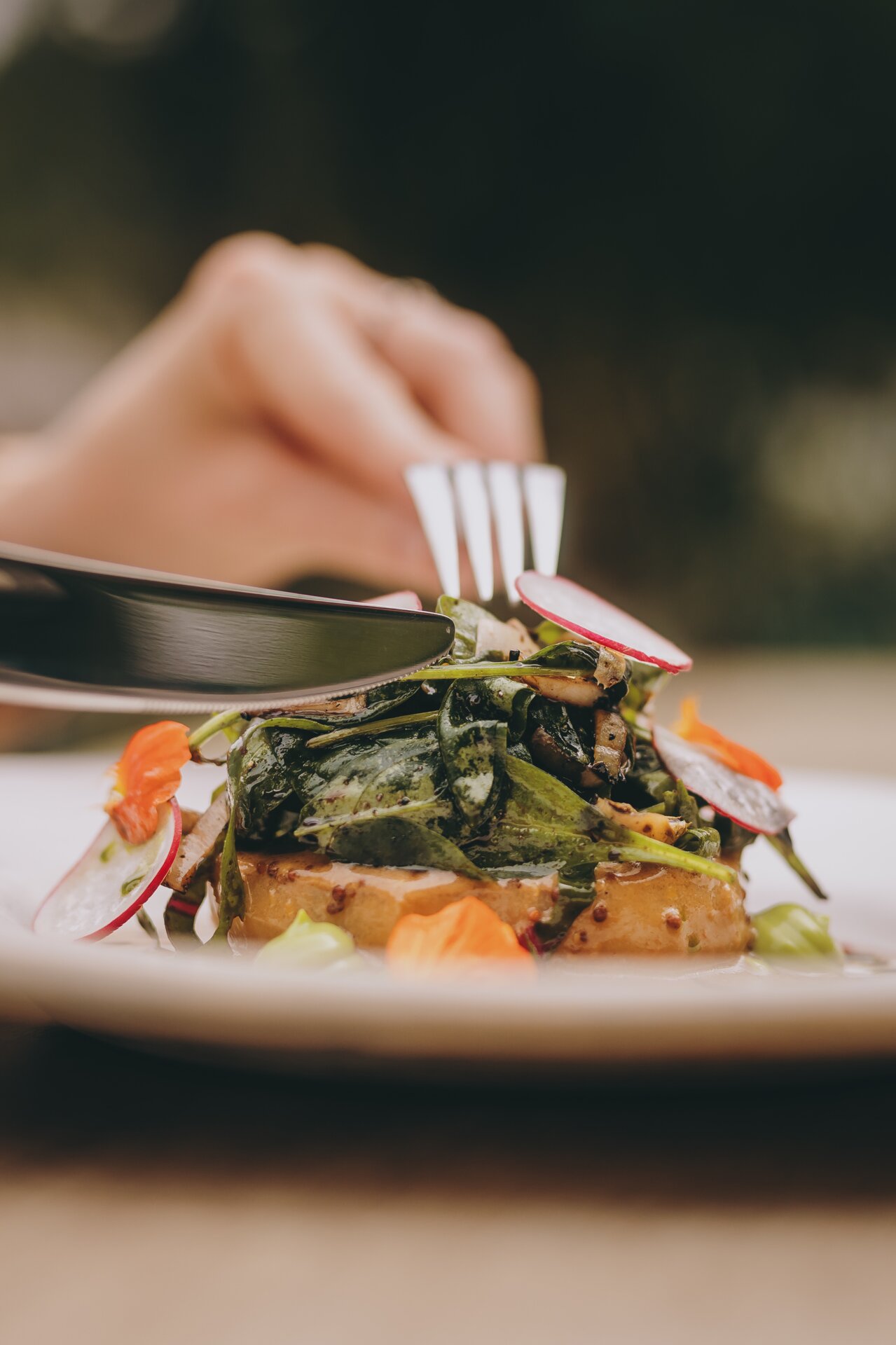 Kohlrabi in 1cm Dicke Scheiben schneiden und in der Sauce warm ziehen lassen. Kohlrabi Scheibe in einen tiefen Teller platzieren, mit Sauce bedecken (das Gericht lebt von der Sauce, nicht sparen). Salat auf den Kohlrabi setzen und mit Liebstöckelmayo und frisch gehobelten, dünnen Radieschen scheiben garnieren. Gerne auch noch ein paar Tropfen Liebstöckel Öl zum Garnieren raufsetzen.