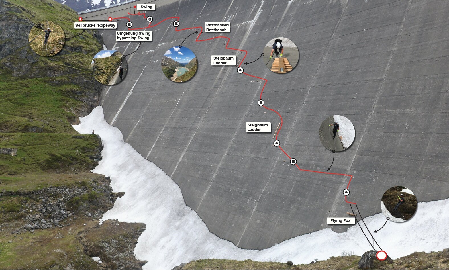 Kurz vor Schluss wartet dann noch ein Highlight auf alle Kletterer, denn um MOBO 107 wieder zu verlassen, schreitet man über eine Seilbrücke, die erneut beeindruckende Ausblicke bietet. Nach insgesamt 240 Metern und – je nach Klettertempo und Rastzeit – 20 bis 50 Minuten ist das Abenteuer geschafft: Dann kann man stolz erzählen, den höchstgelegenen Klettersteig auf einer Staumauer bezwungen zu haben.