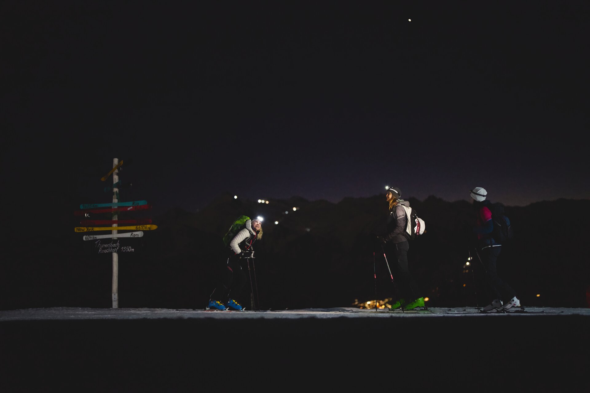 Wenn der Tag in Zell am See-Kaprun langsam dem Ende zugeht und die Nacht über die Berge hereinbricht, machen wir uns bei dieser Tour erst auf den Weg: Es steht ein ganz besonderes Abenteuer am Programm! Die Tour führt hinauf auf einen Berg, der nur Skitourengehern und Winterwanderern vorbehalten ist – auf den Ronachkopf bei Zell am See. Unten im Tal spiegelt sich der Vollmond im Wasser, die hellen Lichter der Stadt funkeln, aber hier oben weisen uns nur das Mondlicht und – zugegeben – unsere Stirnlampen den Weg. Eine magische Stimmung ist es trotzdem.