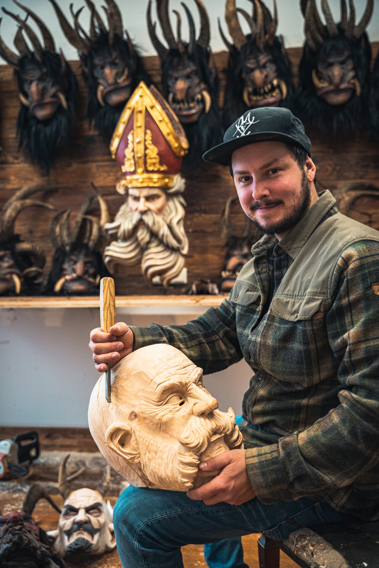 „Aber meine Mutter war Bildhauerin und sie hat dann mit mir gemeinsam – als ich 5 oder 6 Jahre alt war – eine erste Krampusmaske geschnitzt.“ Mit dieser Maske hat er dann begonnen, selbst als Krampus zu laufen. „Das Thema hat mich schnell fasziniert und nie wieder losgelassen“, erinnert er sich. 2010 hat er dann begonnen, selbst Krampusmasken zu schnitzen, hat am Anfang noch jede Maske vorher modelliert, um sie dann in Holz auszufertigen.