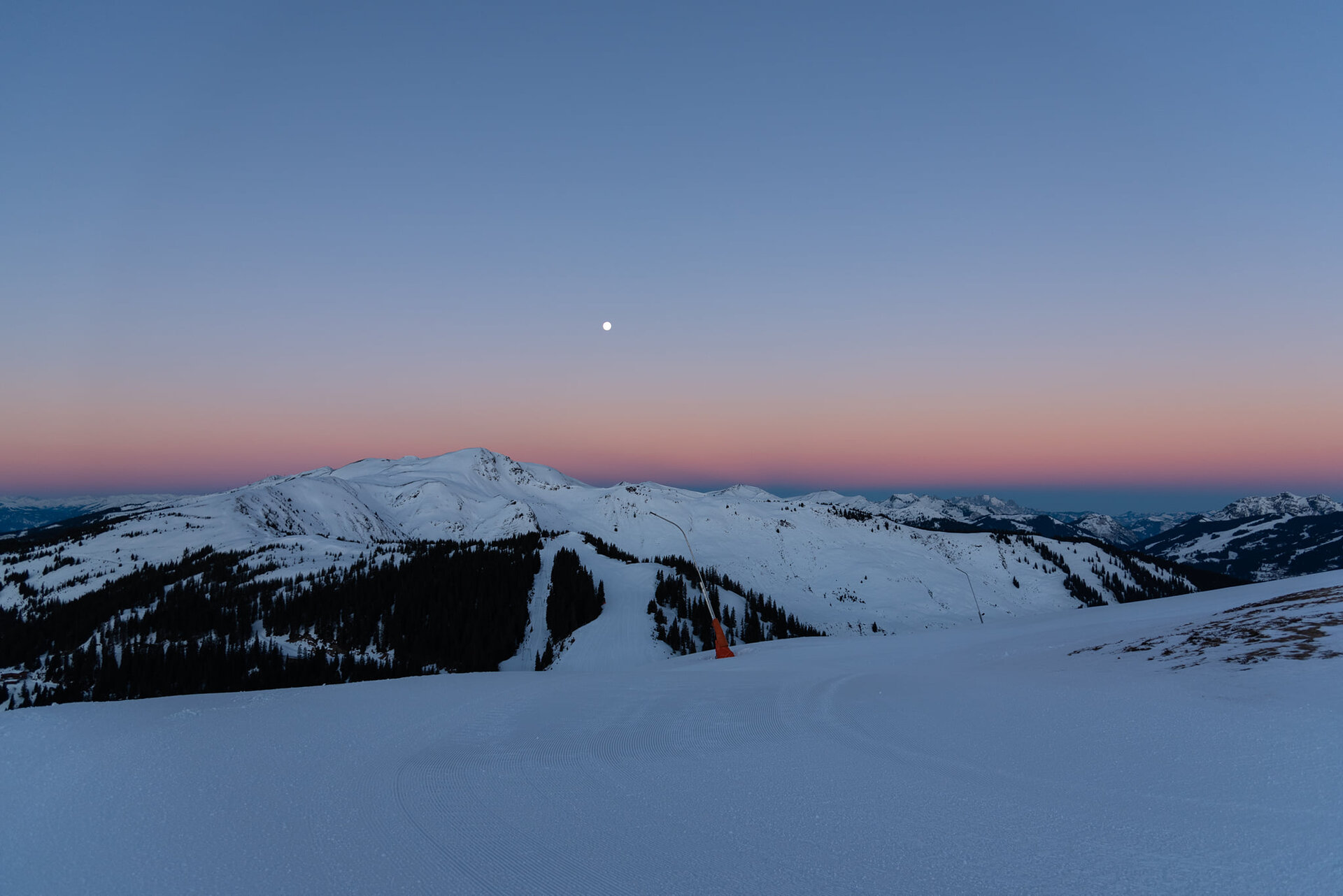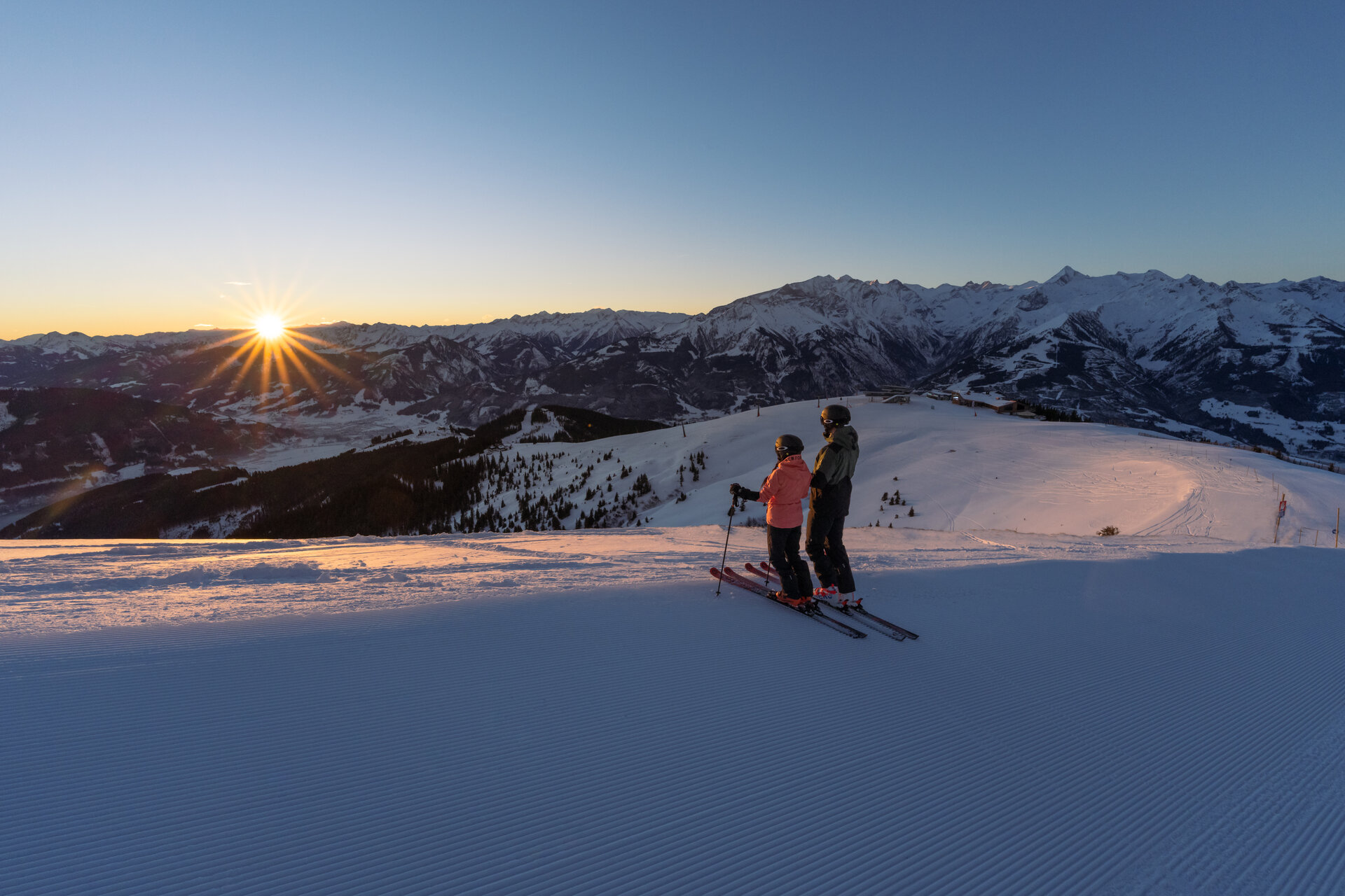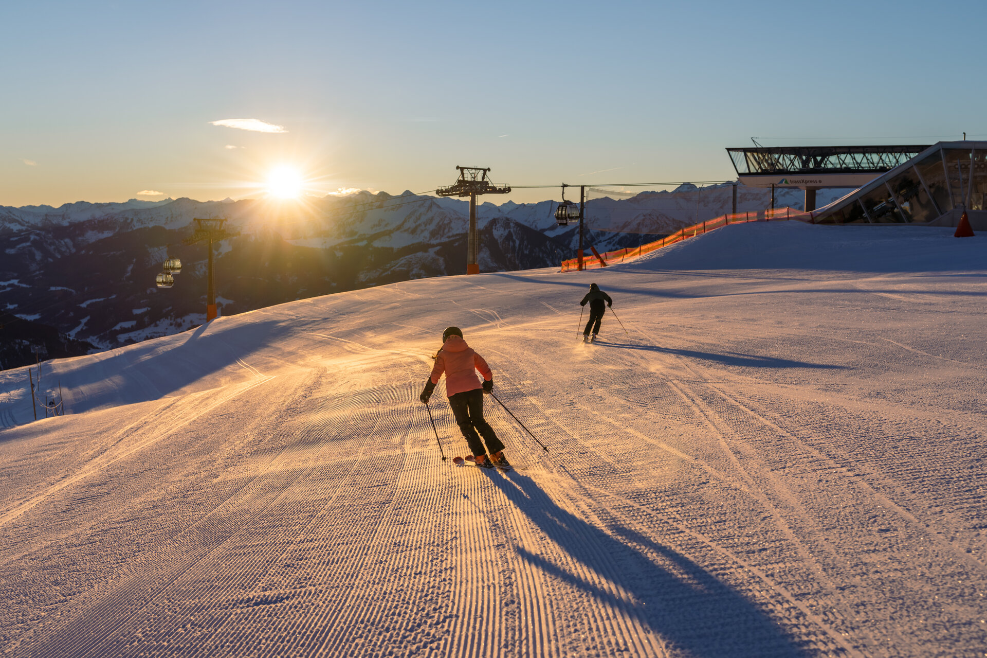 Langsam schiebt sich die Sonne hinter den Bergspitzen hervor: Es ist erst sieben Uhr, doch der Ausblick ist dafür umso schöner! Unberührt liegen uns hier die bestens präparierten Pisten zu Füßen. Und während im Tal der Tag erst langsam beginnt, ziehen wir schon die ersten Schwünge und genießen einen spektakulären Sonnenaufgang in winterlicher Kulisse.