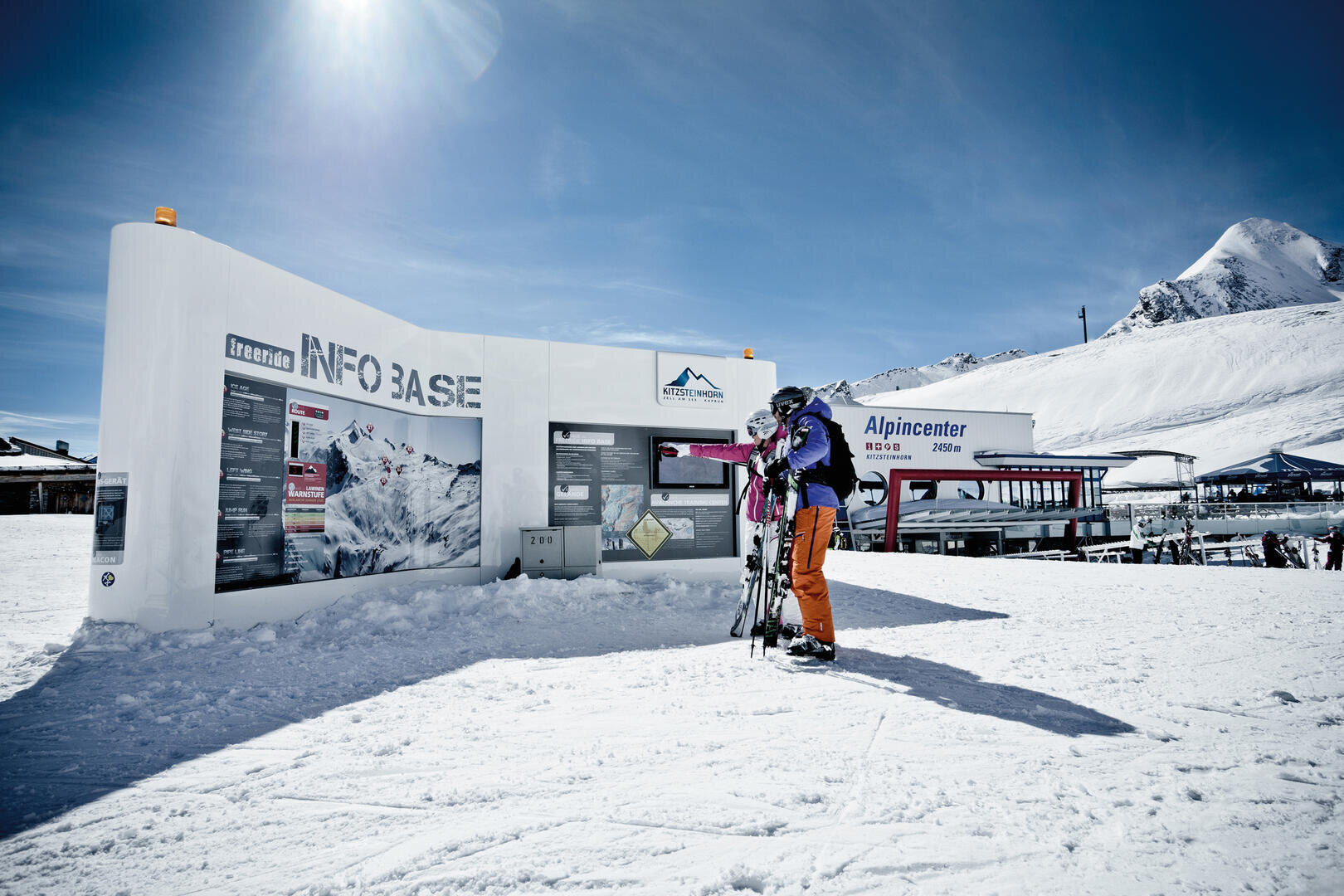 The Freeride Info Base at the Alpincenter on the Kitzsteinhorn and at the Info Points at the access points to the freeride routes provide you with information about the current conditions off the secured pistes. Here you will find all the data about the designated routes, the weather and snow situation, the current avalanche warning level and information about the equipment. You can also test your avalanche transceiver at the avalanche transceiver checkpoint. Using a topographical map, the Info Base shows the gradient of the slopes, potential danger spots and the route’s most beautiful freeride lines.